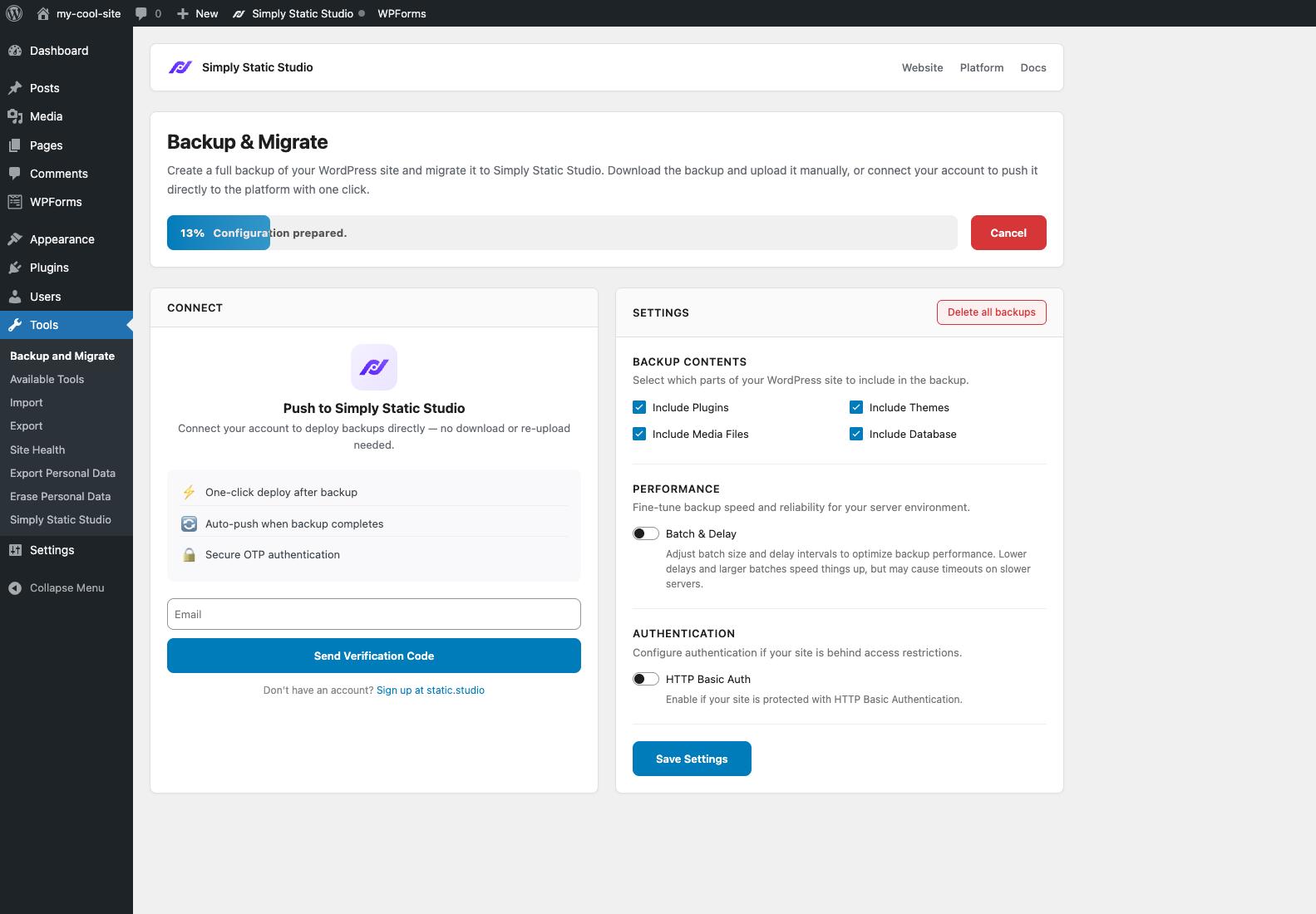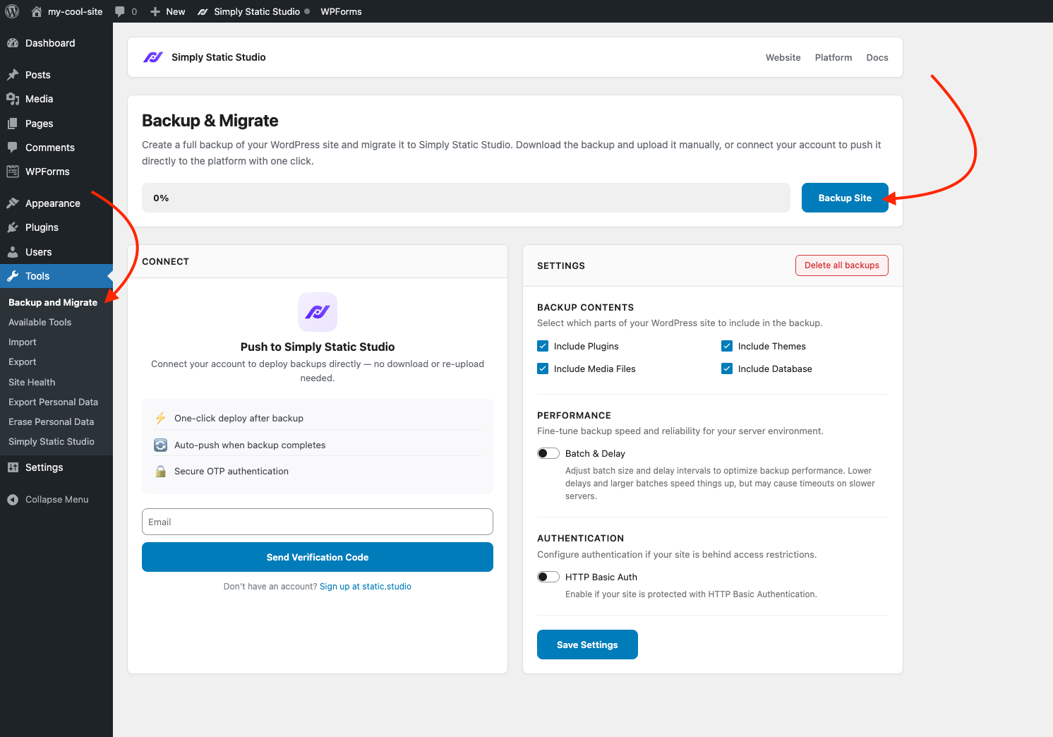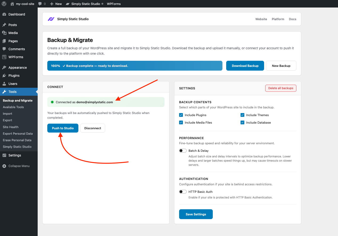 Logging into your Static Studio account will allow you to push your backup directly from within WordPress - no manual download and upload.