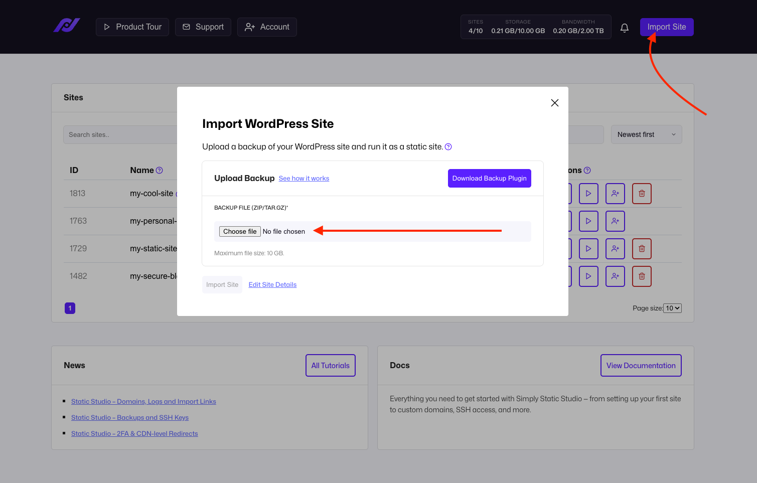 Click on "Import Site", select your backup file, and click "Import Site"