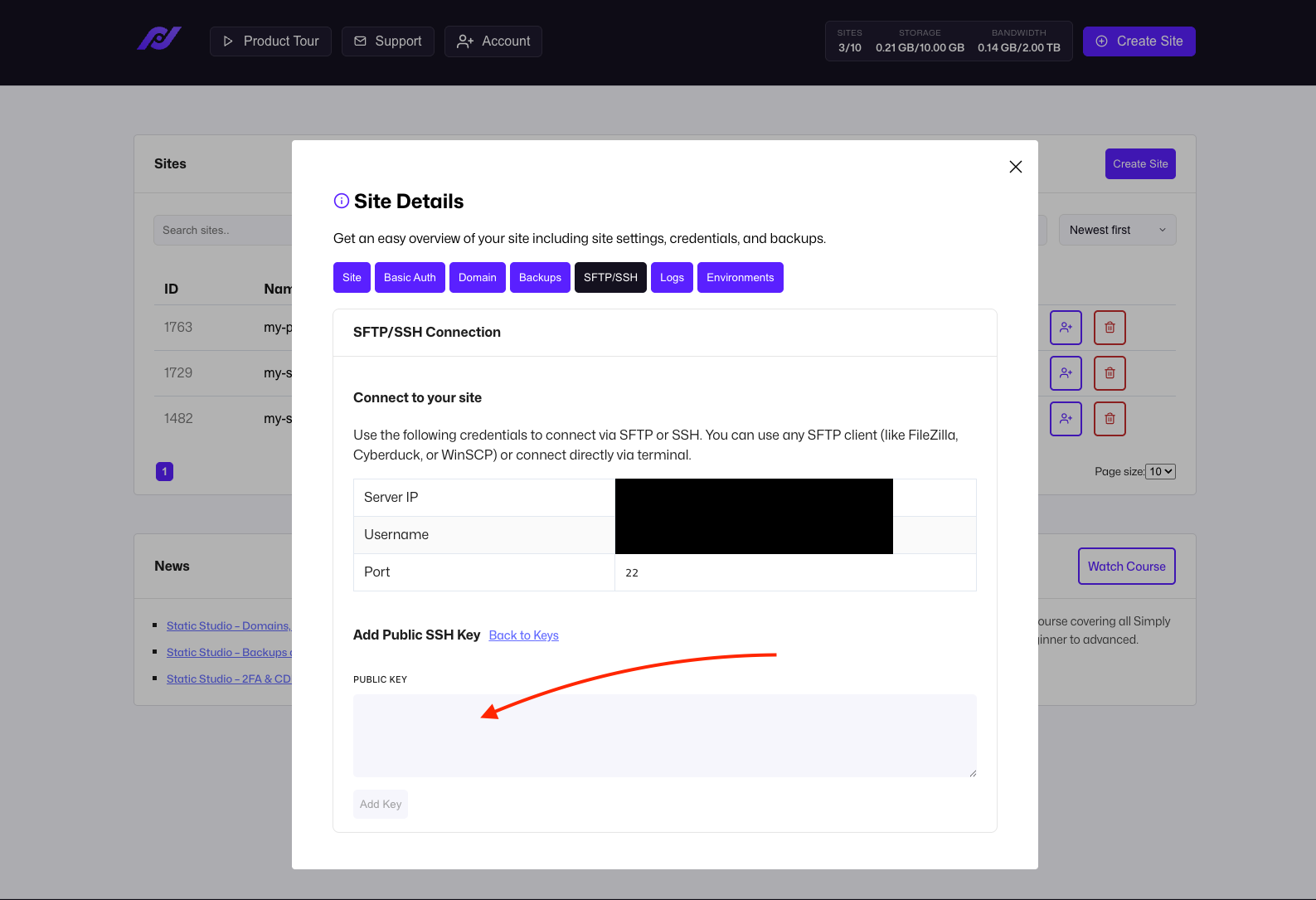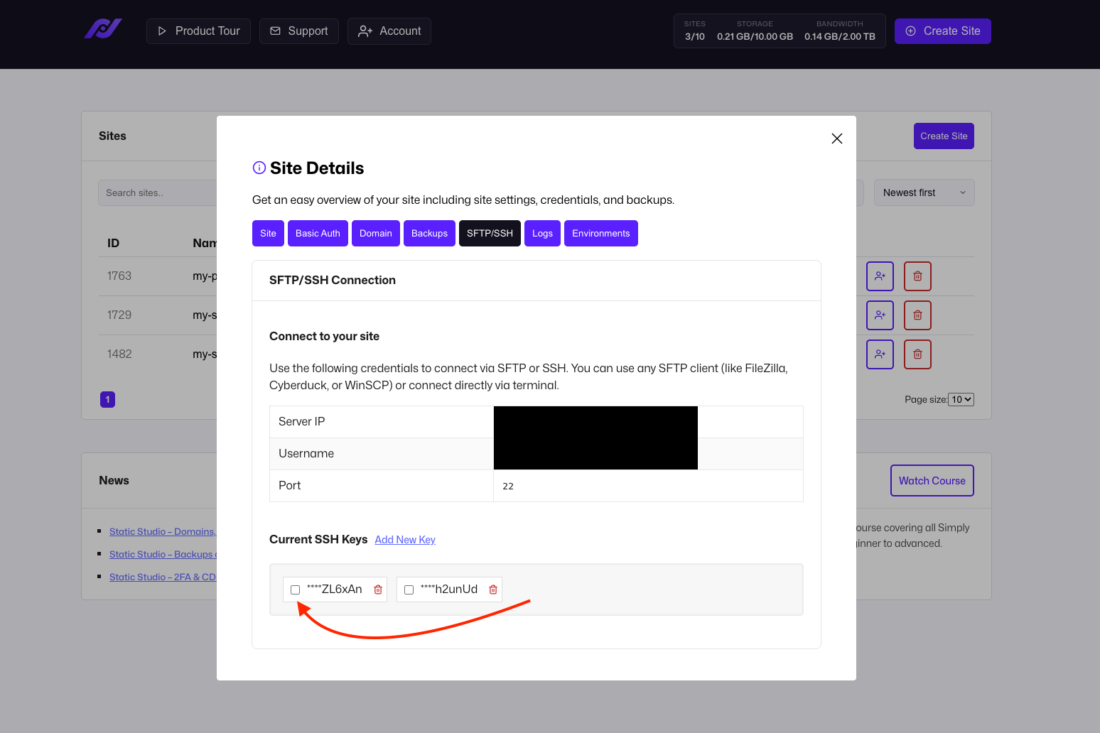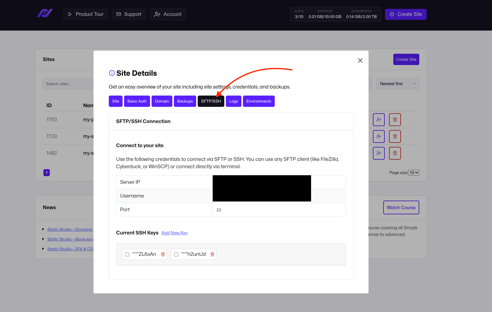 You can manage your SFTP and SSH connections within the Site Details - click on the name of your site and switch to the SFTP/SSH tab: