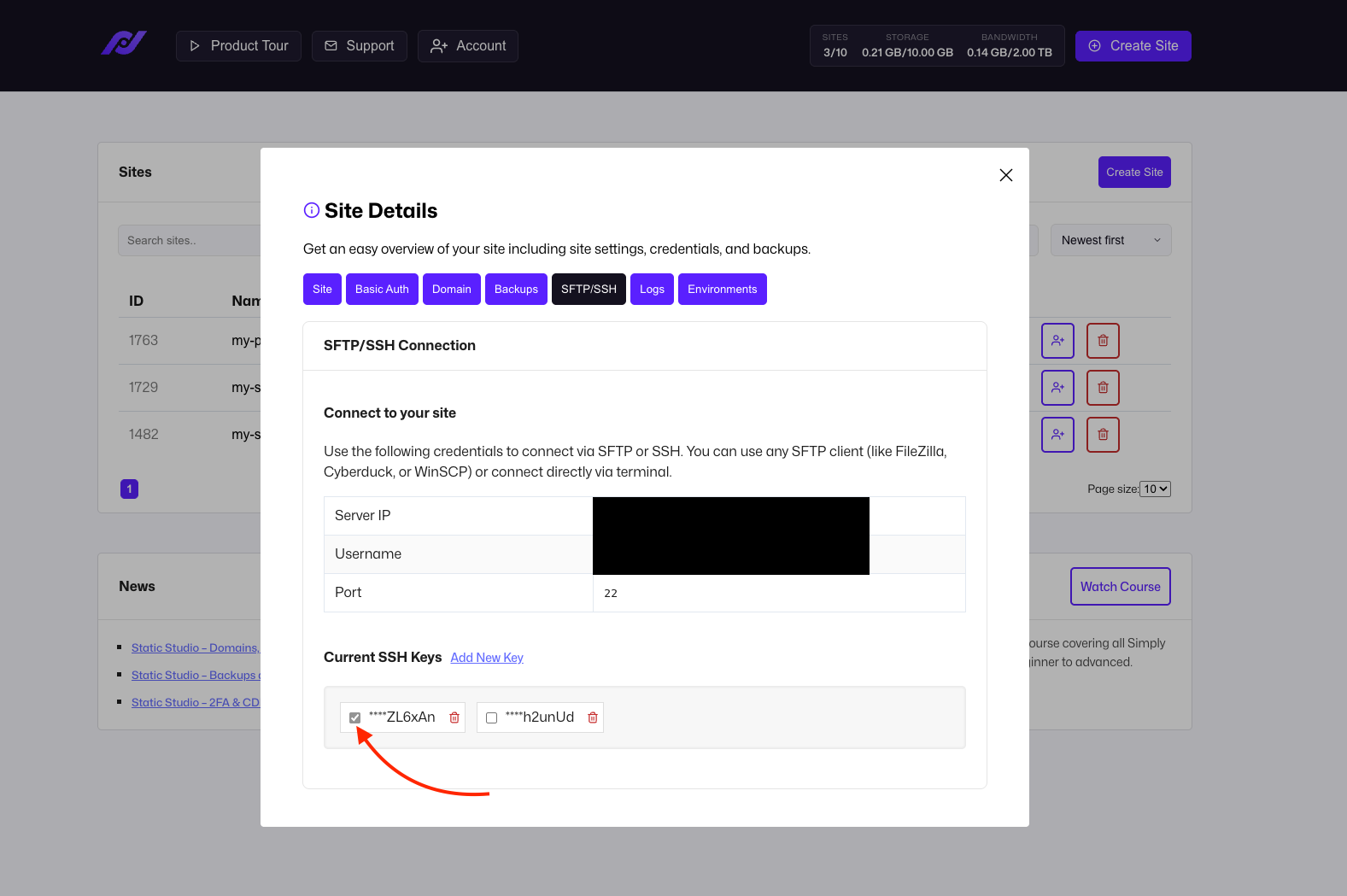 Notice the little checkbox next to the key? Click it to finally grant access to your site for the given SSH key.